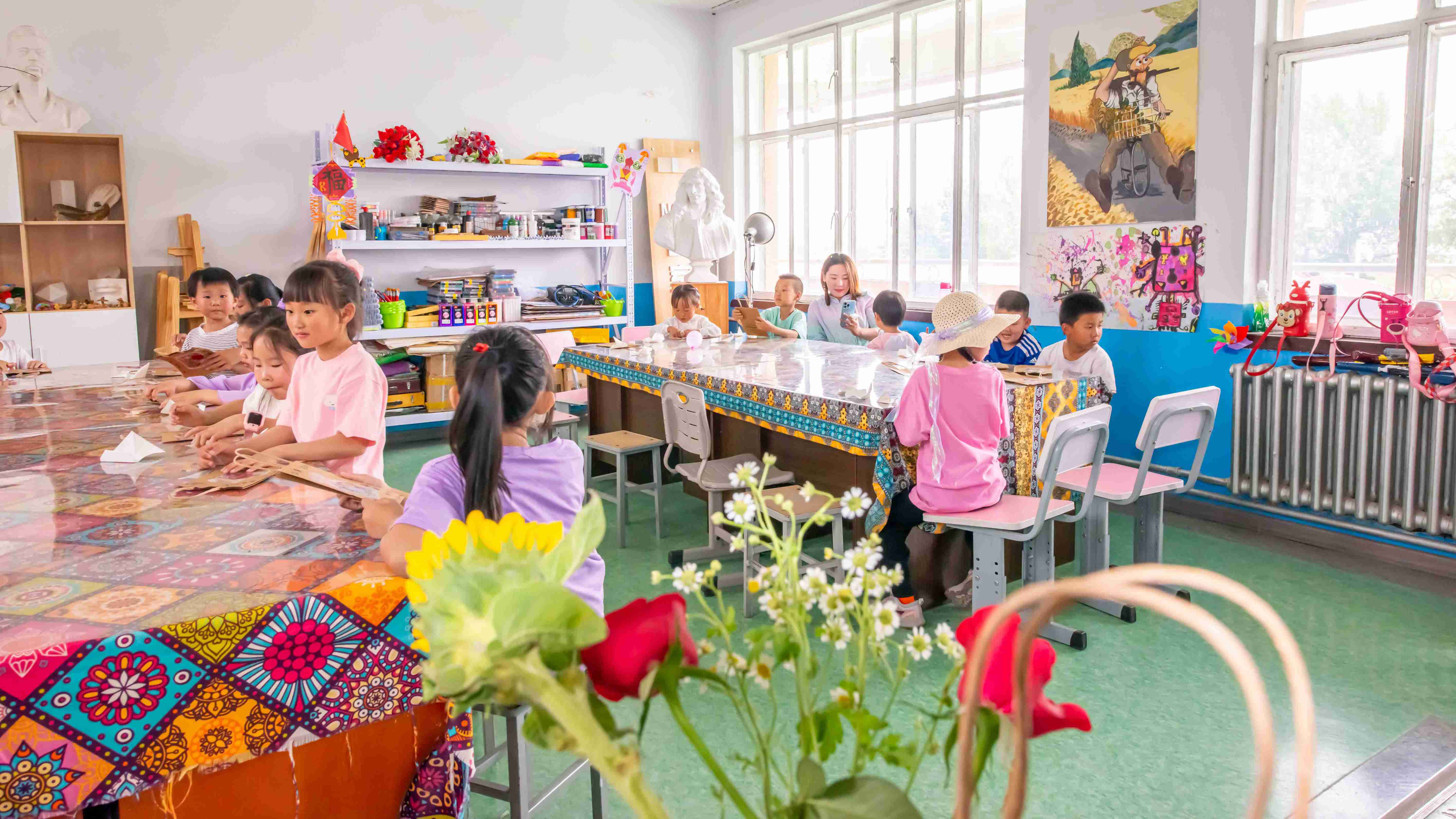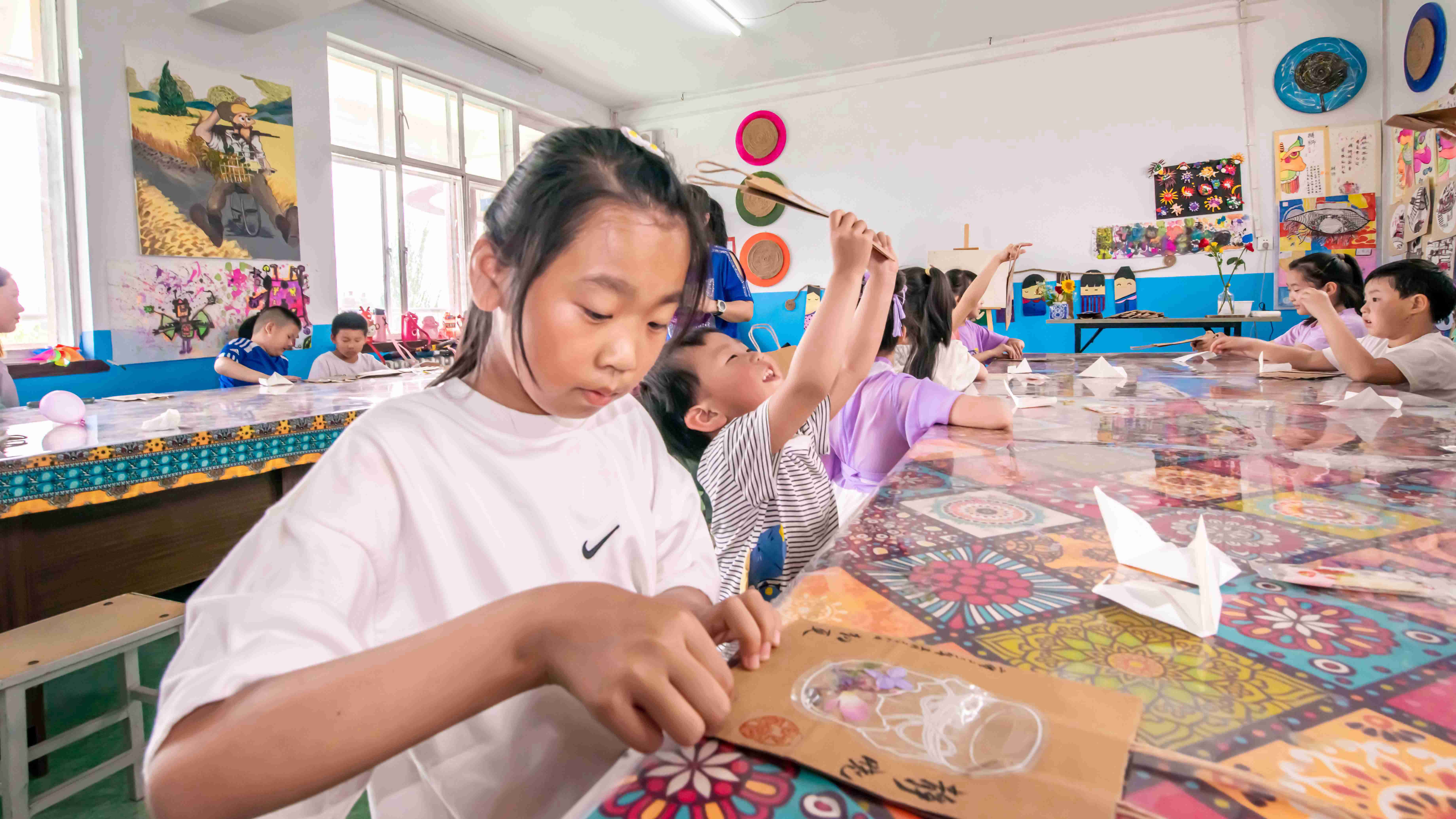組織孩子們繪畫的老師帶領(lǐng)孩子們來到繪畫教室,開啟活動的第一項—手提袋創(chuàng)意標(biāo)本裝飾畫。首先老師開始發(fā)放材料包,將提前準(zhǔn)備好的手提袋、制作植物標(biāo)本的材料發(fā)到孩子們的手中。